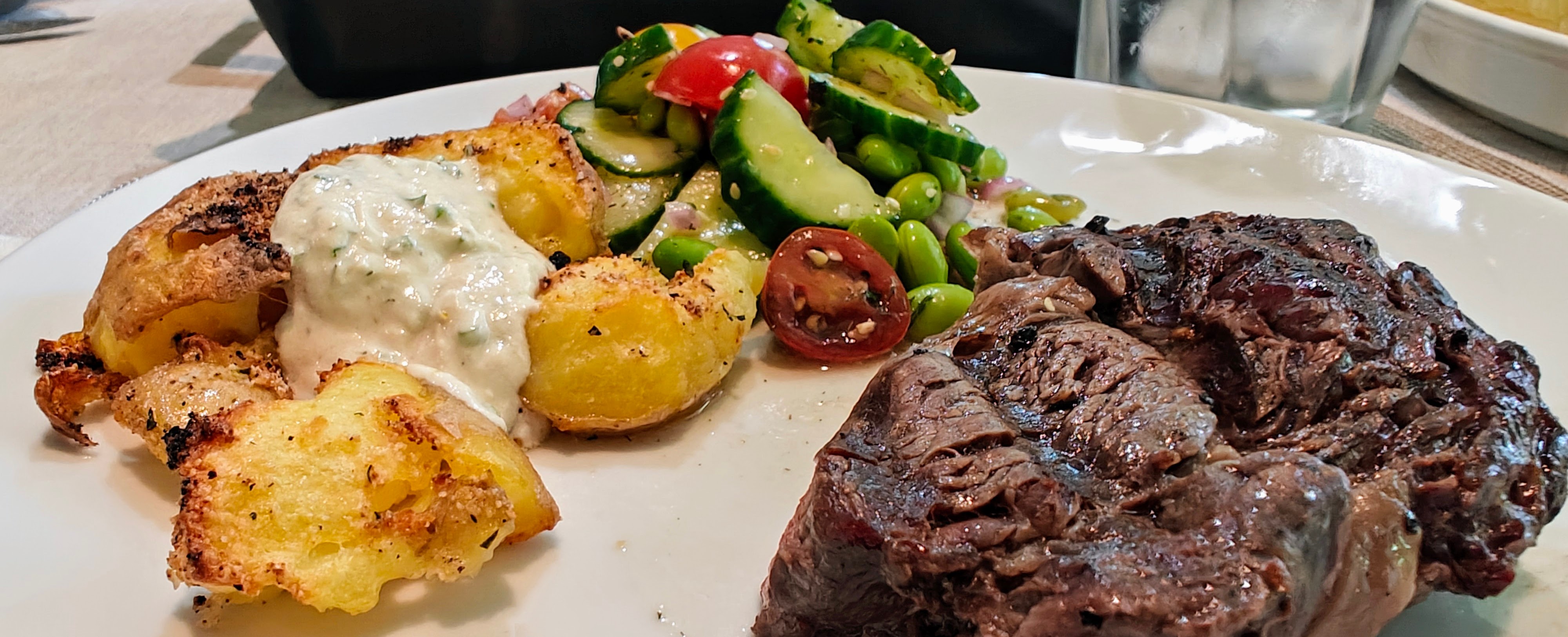 The Saturday before the 4th, I invited my mom and Aunt Joyce over to join Sydnee and me for dinner. Just us. No distractions. We grilled thick steaks I had procured from a local market, the kind of market you just don’t find in China, with amazing cuts of beef, fresh fruit, wines, and vibrant vegetables. We served smashed potatoes with my new Yogurt Herb Dip (a surprise hit) and a crisp Tangy Cucumber Salad to round out the plate.