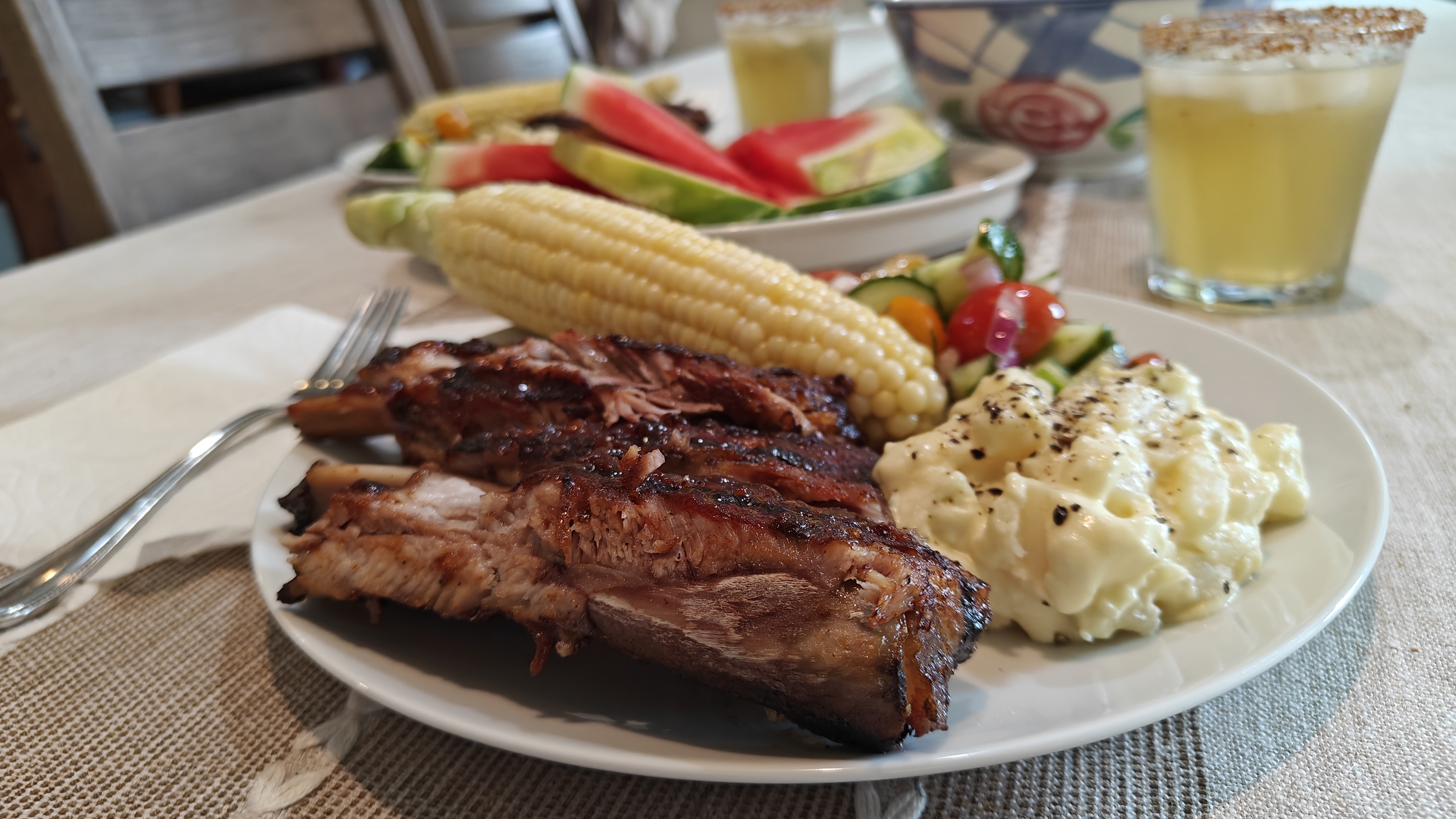 The 4th of July started with breakfast for Sydnee and me (amazing Shakshuka eggs), followed by prepping ribs with a homemade rub — cobbling together a blend of spices after realizing I was out of onion powder and chili pepper. I made it work. While letting the ribs marinate for about an hour, I took Sadie and Lily for a long walk. The day was sunny and calm. Once we returned, the ribs went in the oven to begin their slow transformation.